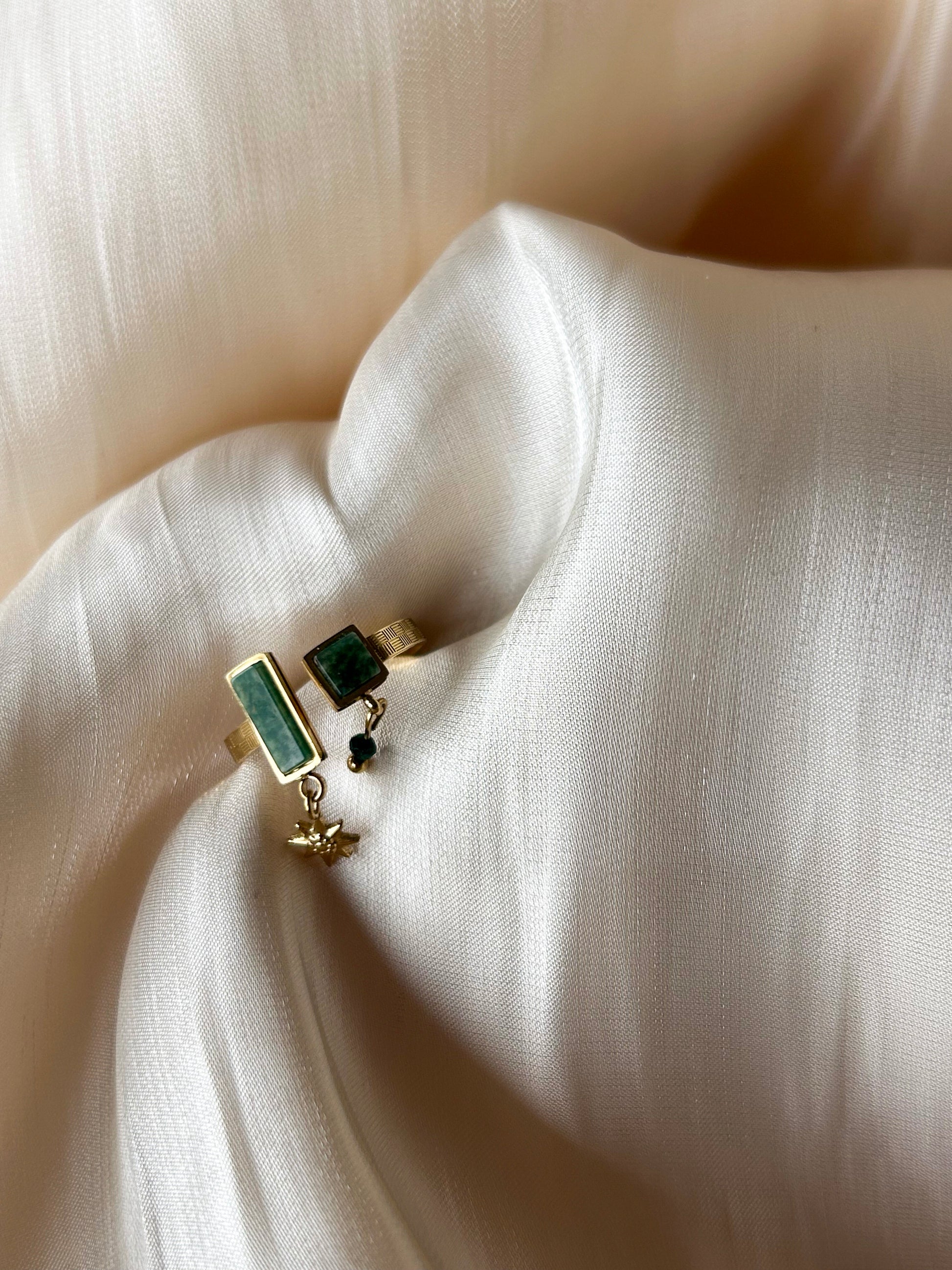 Shop nu deze prachtige gouden ring met open detail en groene stenen en bedels!