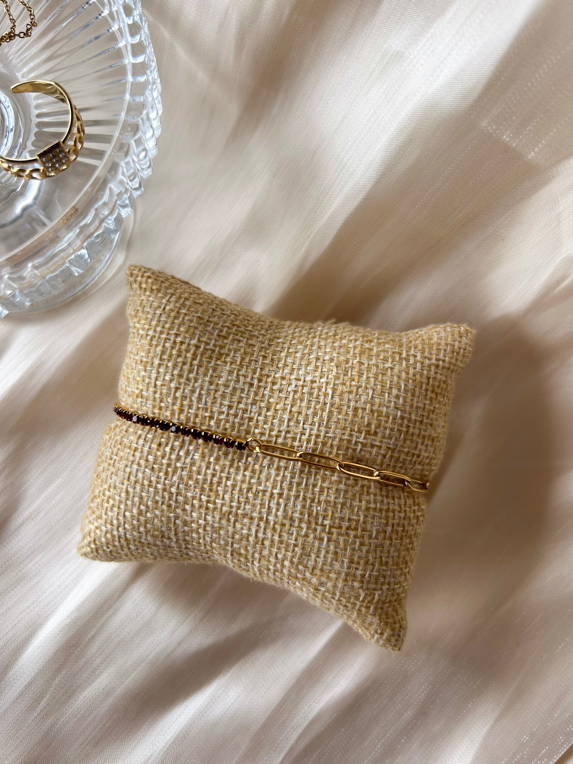de Ember armband heef aan de ene kant glanzende rode zirkonia stenen en de andere kant een ketting. Deze armband, maakt je outfit helemaal af.